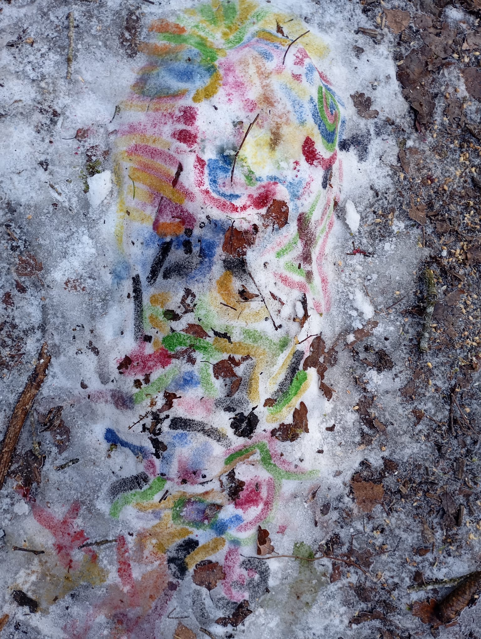 Die letzten verbliebenen Schneeflächen haben wir kreativ genutzt und mit Wasserfarben bunt gestaltet. Mit viel Freude und Neugier konnten die Kinder beobachten, wie sich die Farben auf dem Schnee verteilen und vermischen.