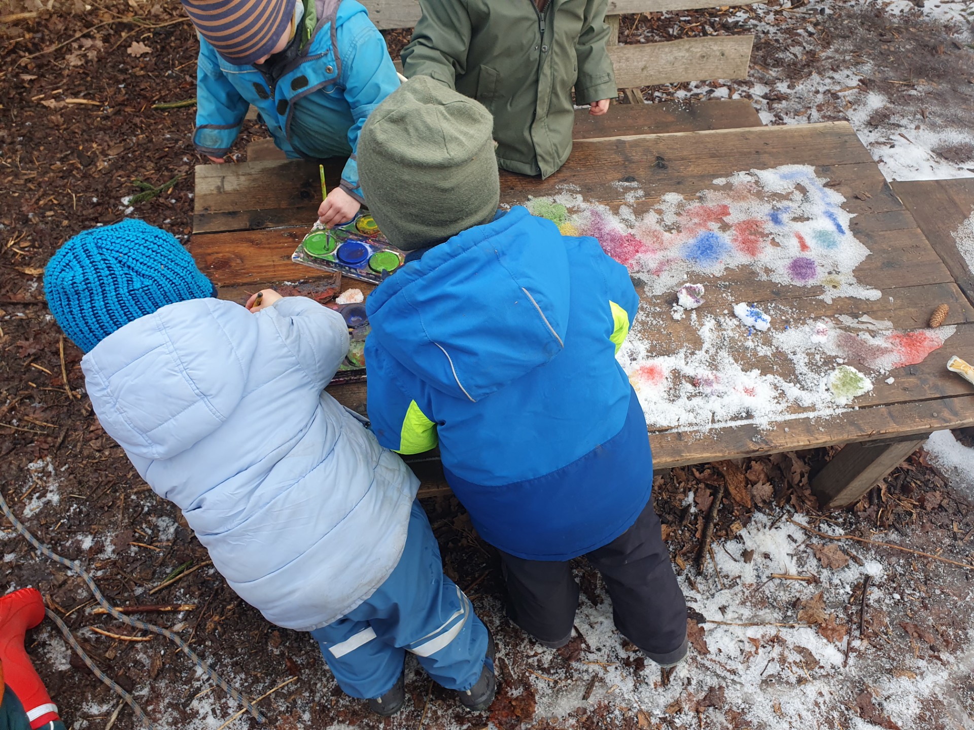 Auch diese Woche begrüßt uns mit frostigen Temperaturen. Wir besuchen die Fichtenzwerge und machen einen gemeinsamen Ausflug in den Fichtenwald. Das Laufen hält uns warm und der Fichtenwald ist sowieso einer unserer Lieblingsorte. Wir singen weiterhin das Lied: „Jetzt wird es draußen kalt“ , in dem es um die Vögel im Winter geht. Mittlerweile haben wir alle Rätsel aus Marina’s Vogelbuch gelöst und sind richtige Vogelprofis. Wir hängen die selbstgemachten Meisenknödel von letzter Woche auf und bekommen Besuch von Blaumeisen, Kohlmeisen, Rotkehlchen, Amseln, Kleibern, einer Haubenmeise und einigen Vögeln, die zu schnell sind um sie zu erkennen.