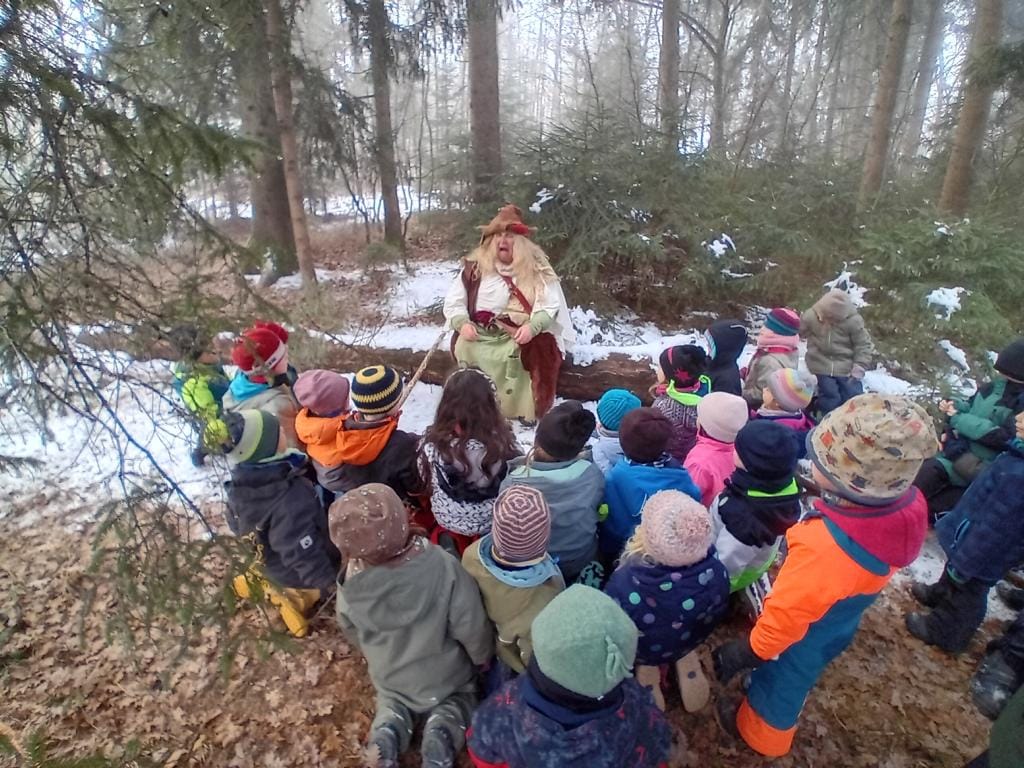 Am Mittwoch machen wir Kinderkonferenz. Da kommt jeder zu Wort und darf sagen was er/sie sich wünscht, was toll ist oder was doof ist und gemeinsam treffen wir Entscheidungen. Tags darauf weckt uns der Tag mit traumhaftem Pulverschnee. Alle Pläne werden über Bord geworfen und wir fahren Schlitten. Und das den ganzen Tag. Rauf auf den Berg, runtersausen und gleich wieder hoch… Von Kälte keine Spur, eine riesen Gaudi sagen wir euch! Ja und am Freitag da ist was ganz wundersames passiert. Wir sind gleich früh aufgebrochen um einen bewegten Morgenkreis zu machen und auf Höhe des Zahlenwaldes stand da plötzlich ein Waldschrat. Also eigentlich eine Waldschrätin, ganz waldig gekleidet steht sie da und sagt, eigentlich ist sie immer unsichtbar und nur Kinder die reine Herzen haben, können sie sehen. Also die Kinder mit den reinen Herzen, das sind natürlich wir und als sie uns fragt ob wir herein kommen wollen in ihr Zauberreich, da sind wir schwupps schon mittendrin. Die Waldschrätin hat den lustigen Namen Pimpernella Pumpelsack. Sie erzählt uns Geschichten, spricht mit Steinen und Baumseelen, lässt uns den Popotanz tanzen und hat sogar von den Zwergen eine kleine Brotzeit für uns dabei. Herrlich ist es in dem Zauberreich von Pimpernella, aber irgendwann muss sie weiterziehen und wir gehen zurück zu unserem Bauwagen. Da wärmen wir uns auf und unterhalten uns noch lange über die Waldschrätin und die magische Welt und fragen uns, ist das gerade wirklich genauso passiert oder haben wir etwa nur geträumt?