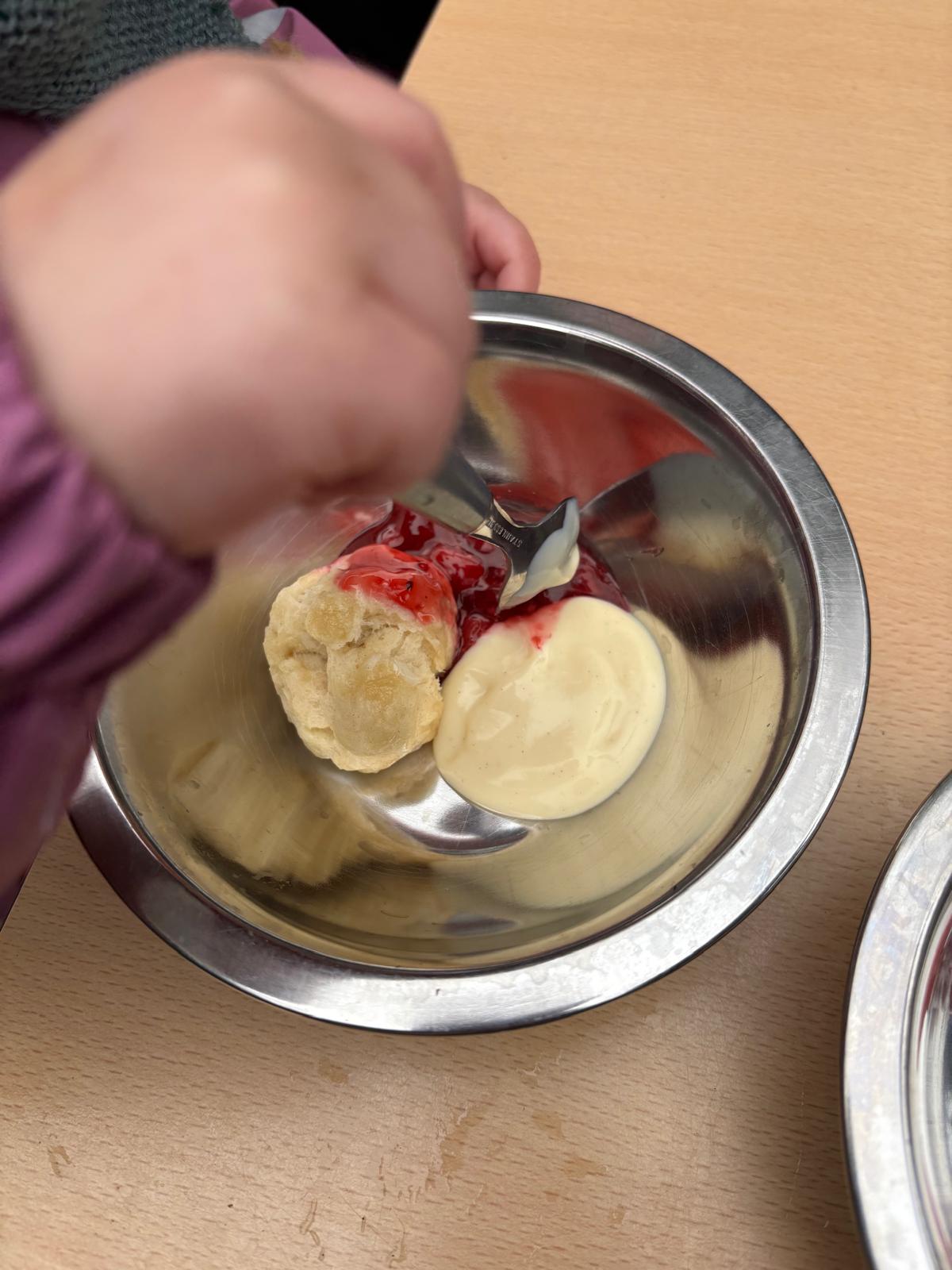 Zur Wochenmitte durften wir ein neues Kind in unserer Gruppe willkommen heißen. Gemeinsam haben wir den ersten Tag gestaltet und uns gegenseitig kennengelernt. Zum Mittagessen gab es etwas besonders Leckeres: Dampfnudeln mit Vanillesoße und roter Grütze – das hat allen sehr gut geschmeckt. Außerdem war Caroline zu Besuch bei uns.