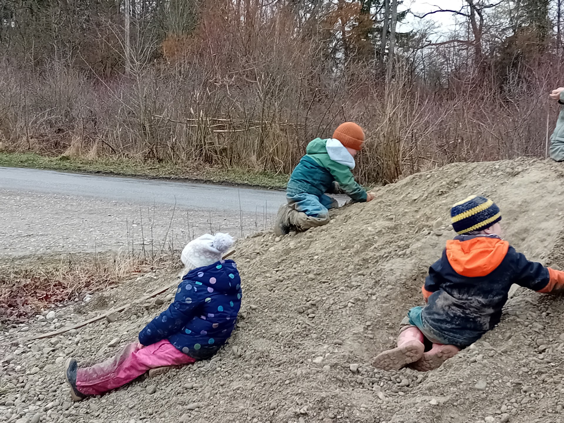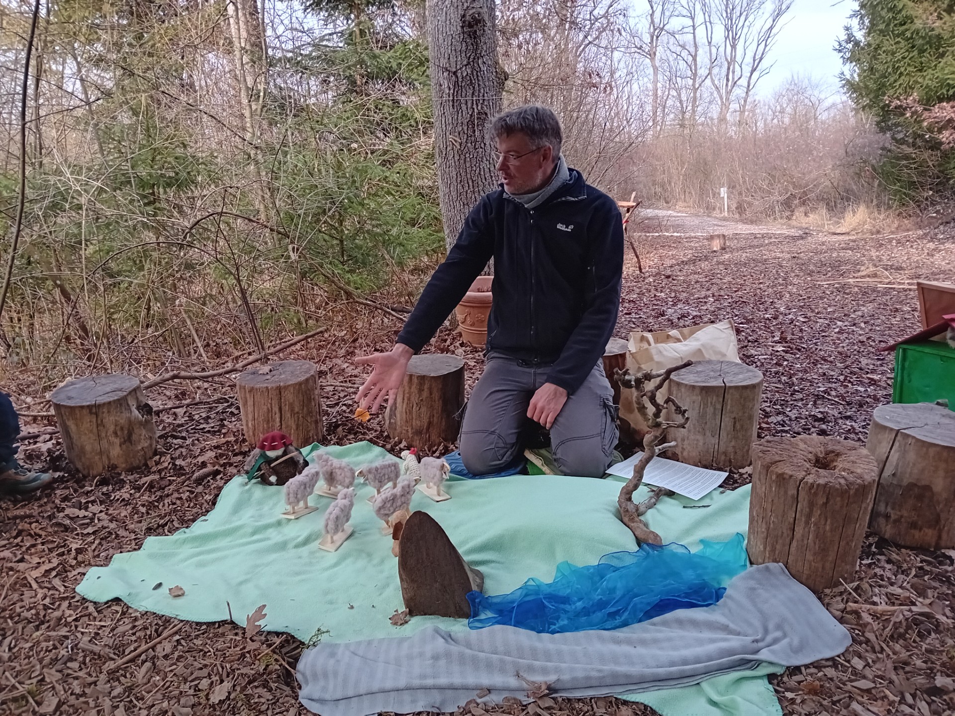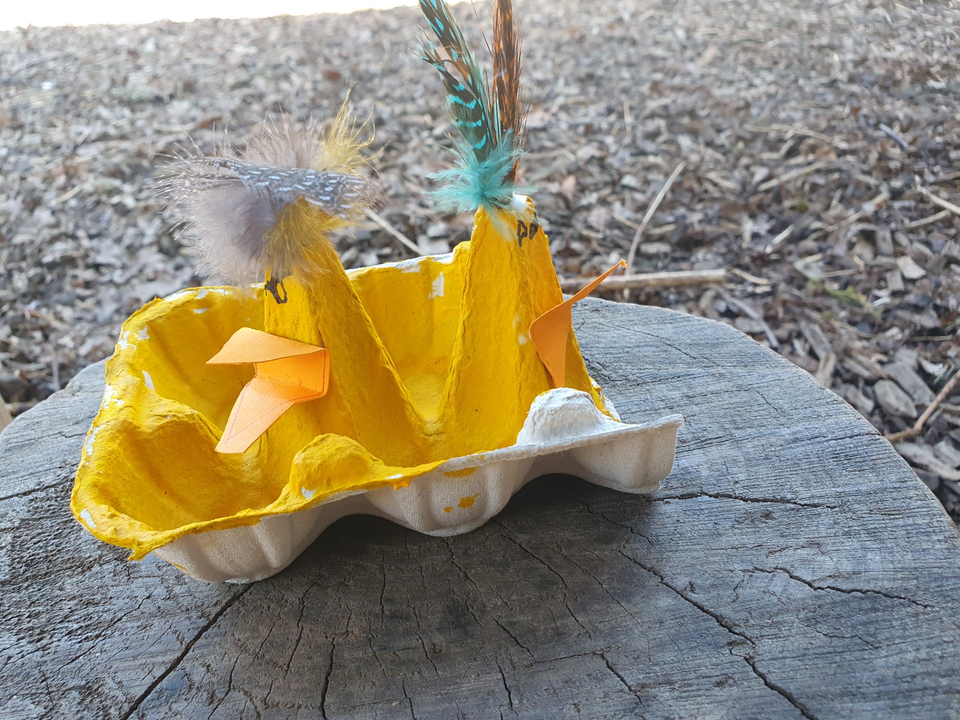 Der Frühling zeigt sich mit kleinen und großen Gesten und auch Ostern rückt immer näher. Wir singen weiterhin unser Lied von den Weidenkätzchen und nachdem wir jetzt textsicher sind, macht das singen gleich noch mehr Spaß. Wir pflanzen ein paar Blümchen in unserem Blumenkasten und da sich die Jahreszeit am Freitag ändert, spielt uns Marina ein kleines Theater zum  Märchen der zwölf Monate vor. Wir machen einen Ausflug zum Steinhügel und finden gelb leuchtenden Huflattich. Wir rutschen den Berg herunter und bauen mit Steinen und Sand. Der Osterhase ist beib uns Kindern schon in aller Munde und wir fragen uns, was er uns wohl bringen wird. Damit er etwas hat, wo er seine Geschenke hineinlegen kann, fangen wir an unsere Osternester zu basteln. Mit gelber Farbe malen wir Eierkartons an, schneiden Schnäbel und Gras aus und gestalten kleine Küken in einem Nest. Total süß sehen die Nester aus, da wird der Osterhase staunen. Martin erzählt uns ein tolles Figurentheater über „Das Schaf Charlotte“. Das war vielleicht spannend. Der Hirte war nämlich verletzt und das Schaf Charlotte hat sich auf den gefährlichen Weg gemacht, um Hilfe zu holen. Bei unseren gruppenübergreifenden