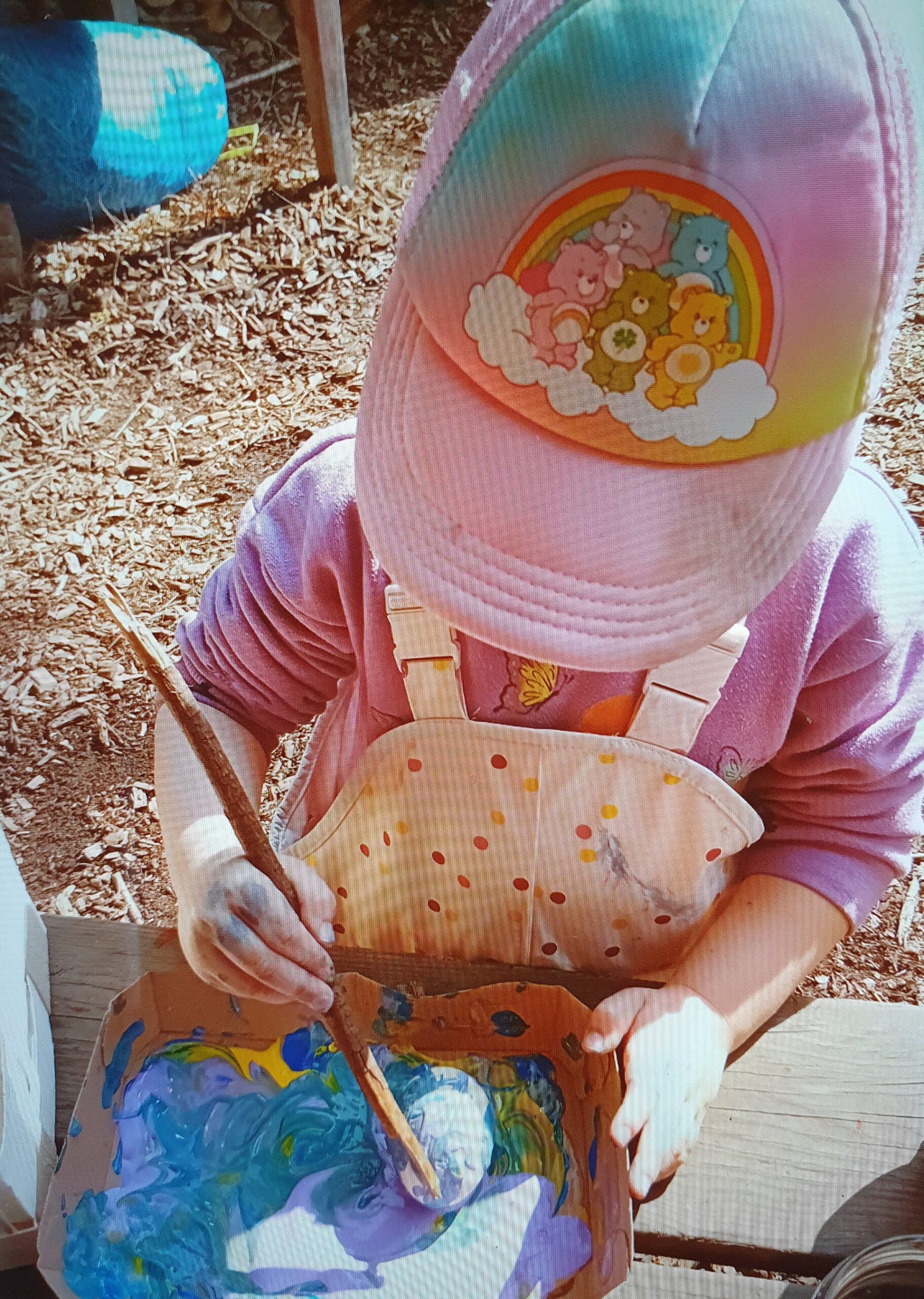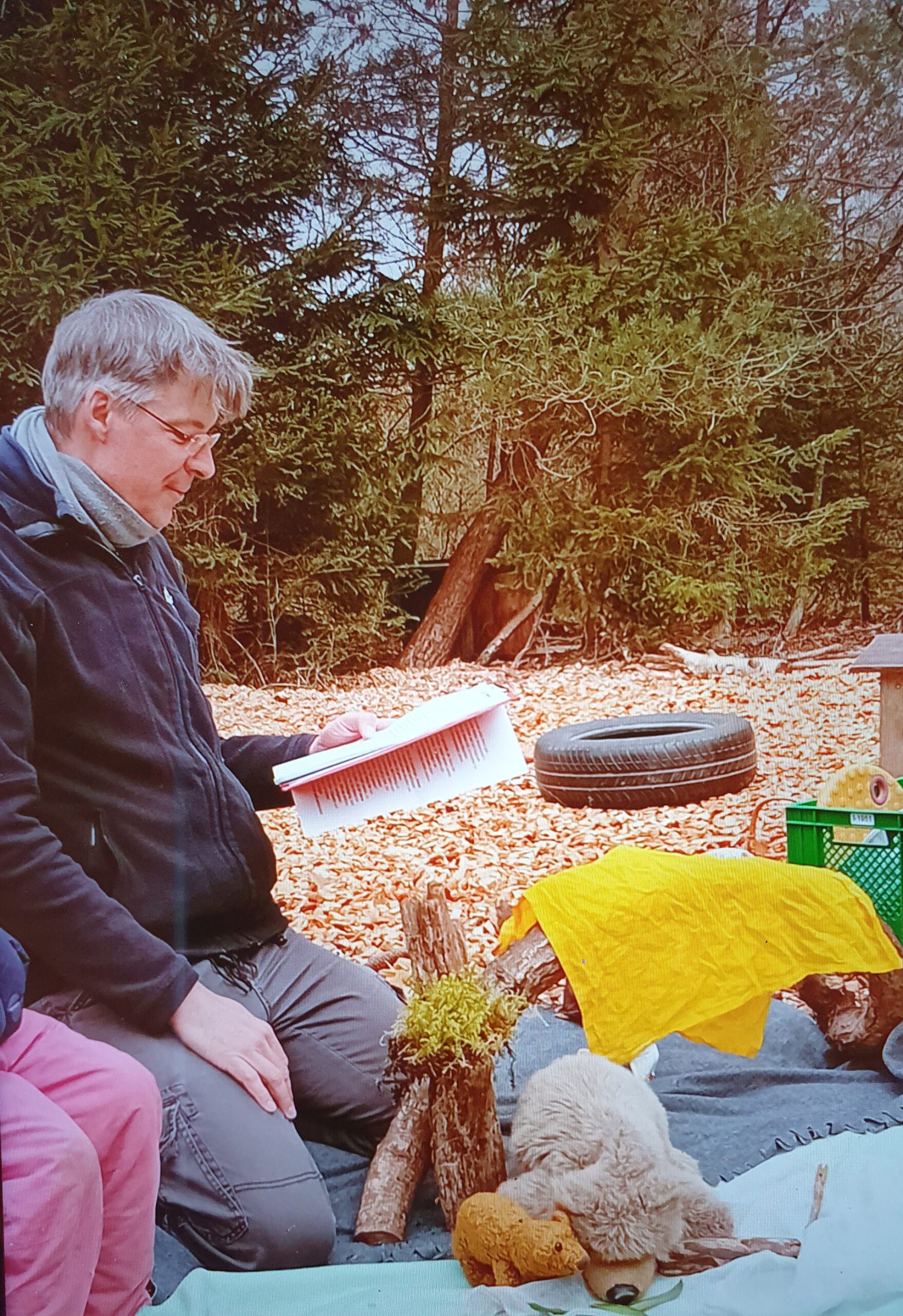 Am Mittwoch kommt eine riiiiiiesige Lieferung Hackschnitzel. Ein unglaublich hoher Berg ist das und wir helfen natürlich mit diese zu verteilen. Na gut, wenn wir ehrlich sind, bauen wir uns Betten in dem Berg und Höhlen und wir graben und kugeln uns den Berg herunter 🙂 Dass die Erwachsenen die Hackschnitzel verteilen wollen, finden wir erst gar nicht so toll. Aber dann packen wir doch fleißig mit an und am Ende des Tages sind wir alle angenehm erschöpft und zufrieden mit unserer Arbeit.
