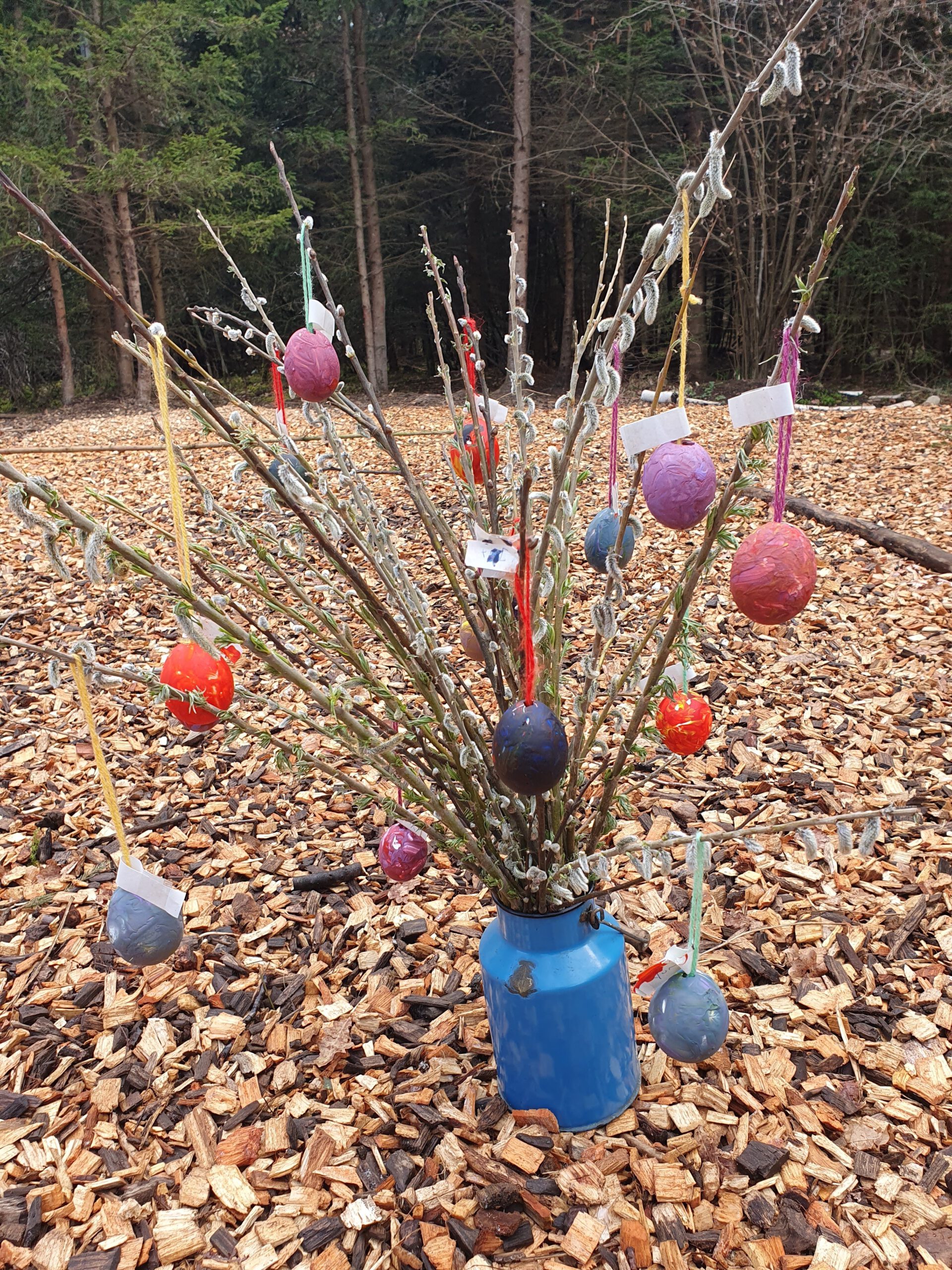 Wir singen in den Kreisen das Lied „Stups der kleine Osterhase“, das viele von uns schon kennen. So schallt es laut durch den Wald, damit der Osterhase auch wirklich genau weiß wo er hin muss. Wir bemalen unsere ausgepusteten Eier und hängen sie an unseren schönen Osterstrauch.